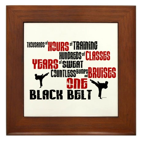 one_black_belt_2_framed_tileTo me, more training equates to getting better and that’s what it’s all about. It was said in class this week, “If you do something — anything — for 4 years or more, how could you not get good at it?” What doesn’t resonate as much with me is an arbitrary belt color for the sake of that belt color. I am not about status in the school. I don’t get off strutting around with a higher belt than someone who’s just joined and is suffering through their first class. I don’t need that kind of validation. In fact, I still consider myself only intermediate level so what do I know? Instead, I need to know what I have to improve upon and have some personal reassurance that I am getting better. The belt helps, I suppose, but what’s better is finally getting the hang of a lead front kick or a whopping 180. The feeling of speed as I can throw in a double jab faster than a few months ago. The pride of feeling less fatigue after a long sparring match or prolonged pad work.